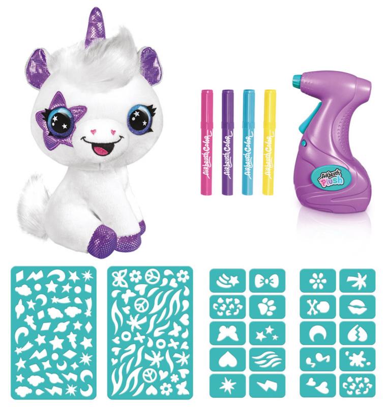 Obsah balení: plyšové zvířátko, airbrush nástroj, 3 různé barevné náplně, 120 různých šablon, plastové ochranné rukavice, návod