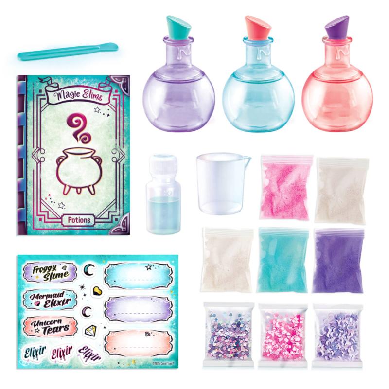 Novinka Magický elixír – sada zabaví každé tvořivé ručičky. Vytvořte si jedinečné magické elixíry do lahviček. V balení naleznete návod i recepty na jednotlivé lektvary ze slizu. Zamíchejte prášky, vodu, třpytky – jako skutečný kouzelník nebo alchymista! Sliz natahujte, mačkejte, hrajte si a užijte si zábavu.