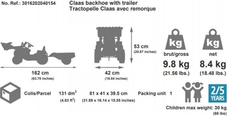 Součástí traktoru je funkční nakladač, který děti mohou snadno ovládat, a vlečka pro převoz drobných předmětů, což rozšiřuje možnosti hry a podporuje kreativitu. Rozměry traktoru s vlečkou činí 162 cm na délku, 53 cm na výšku a 42 cm na šířku, což zajišťuje stabilitu a pohodlné ovládání.