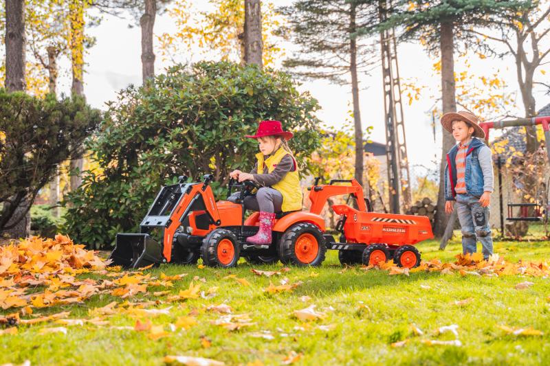 • Falk šlapací traktor Kubota s přední a zadní funkční lžící a přívěsem.