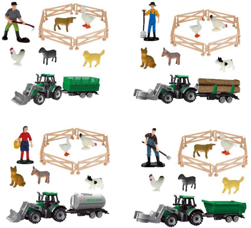 Farmářský plastový herní set. Součástí traktor s přívěsem, hospodářská zvířata, figurka farmáře a oplocení. 4 varianty povedení.Farma s příslušenstvím je kreativní herní sada, která potěší všechny malé milovníky venkova a zvířátek. Obsahuje plastové figurky hospodářských zvířat, jako jsou krávy, koně, ovce nebo prasátka, a k nim odpovídající příslušenství – ohrady, stromy, krmivo či farmářské nástroje. Děti si mohou sestavit vlastní farmu a vymýšlet příběhy ze života na venkově. Hračka podporuje rozvoj jemné motoriky, představivosti a schopnosti kombinovat. Díky různým variantám provedení se každá sada může mírně lišit, což přináší další možnosti pro hru a sbírání. Vhodné jako doplněk k dalším farmářským sadám nebo jako samostatná hračka.