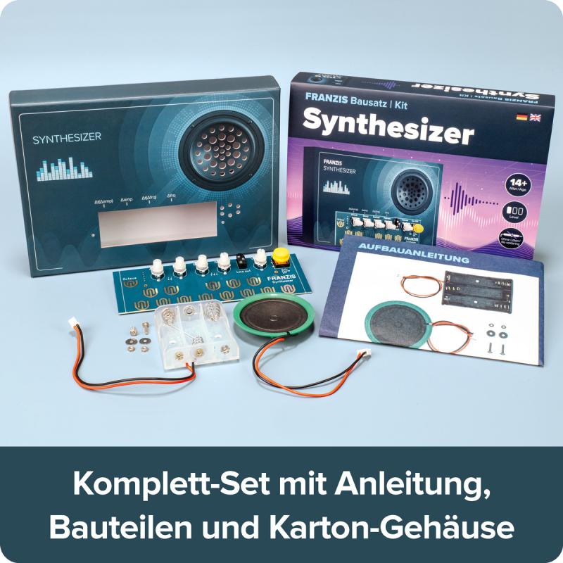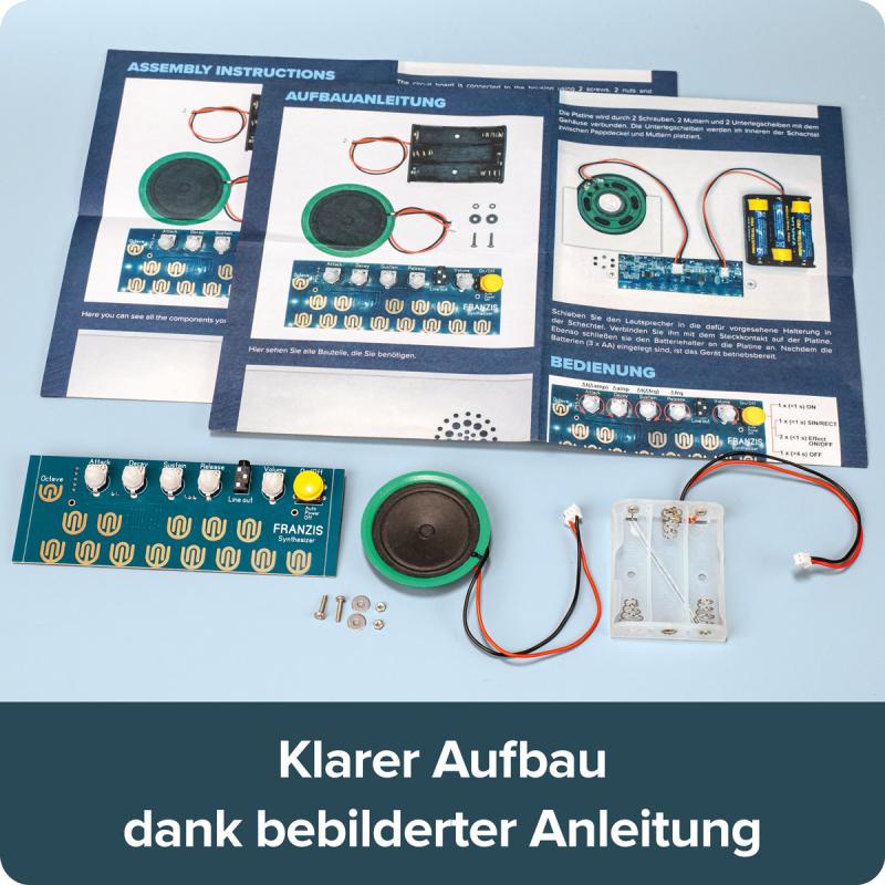 Syntezátorová sada FRANZIS nabízí snadný vstup do světa tvorby elektronického zvuku. Všechny klíčové vlastnosti jsou jasně uvedeny na obalu: dvouoktávová, dotyková klaviatura, pět přesně nastavitelných knoflíků pro tvarování zvuku, integrovaný reproduktor a praktický linkový výstup pro připojení externích zařízení.