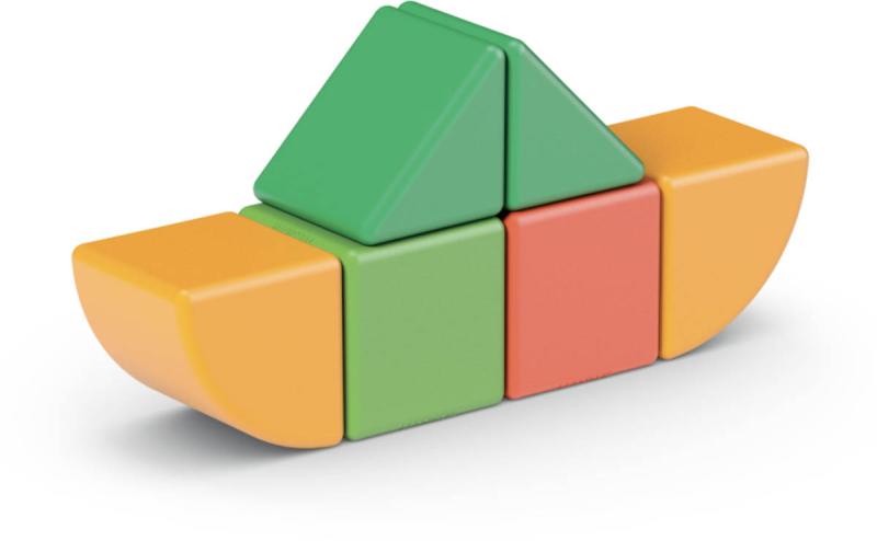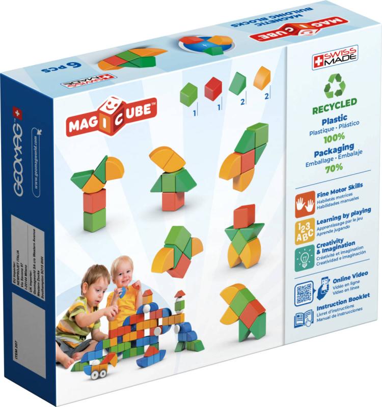 Součásti balení: Obsahuje 6 magnetických kostek (2 kostky, 2 půlkostky, 2 čtvrtkruhy). Vhodných pro batolata od 1 roku. Kostky májí vždy všechny strany v jedné barvě. V balení jsou kostky 4 různých barev.