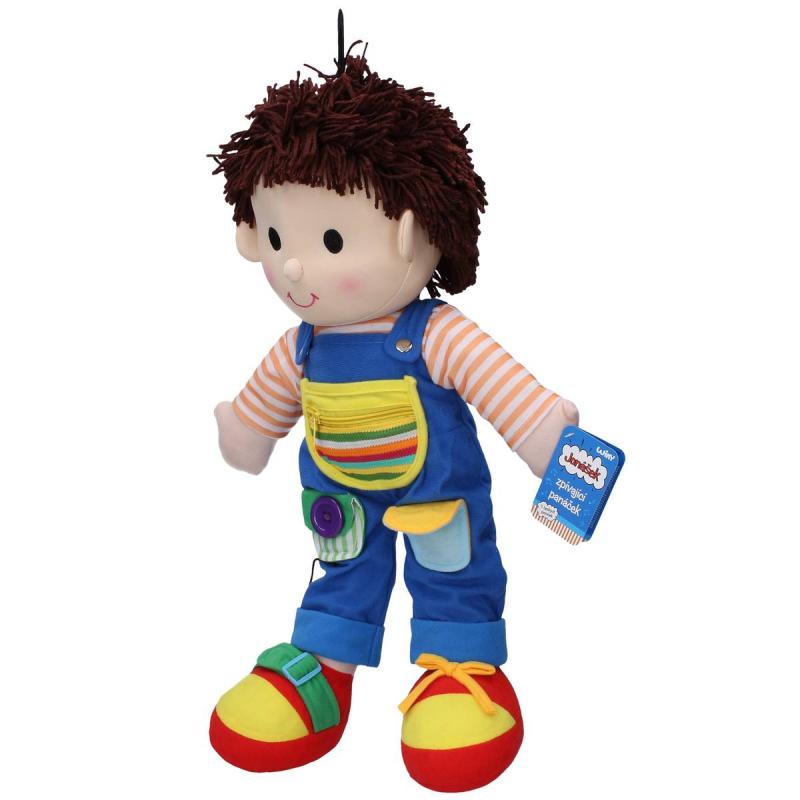 Textilní panáček (panenka) Jonášek zpívající. Velikost 55 cm. Zpěv aktivujete tlačítkem na bříšku. 1 stisk - spustí se písnička, další stisk písničku vypne, další stisk spustí další píseň. 5 písní - Já do lesa nepojedu (0:25), Kolo kolo (0:25), Okolo Hradce (0:30), Komáři se ženili (0:21), Zajíček (0:15).