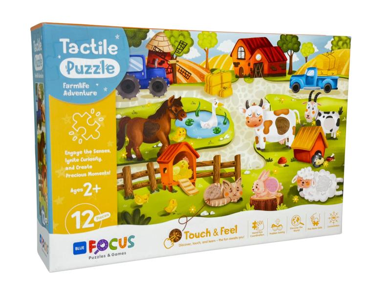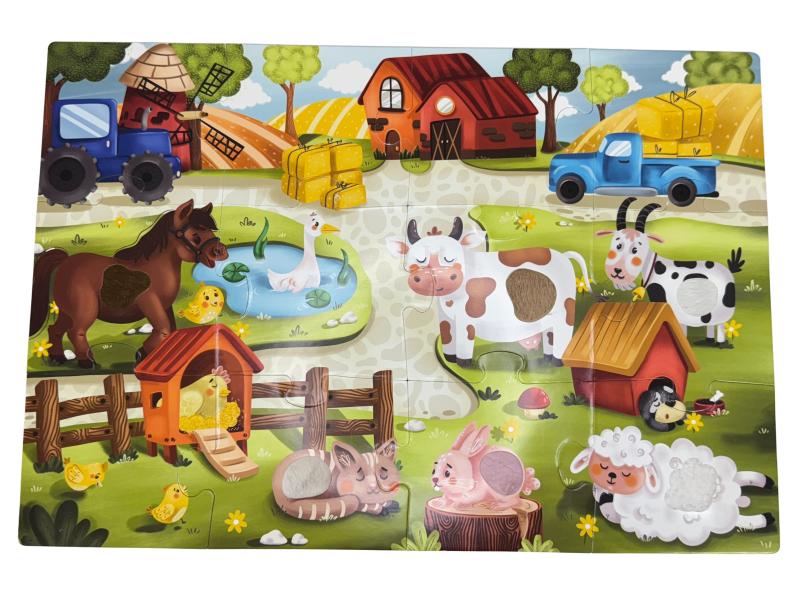 Dětské puzzle farmářská zvířátka 12 dílků. Toto hmatové puzzle seznamuje s hospodářskými zvířátky prostřednictvím smyslové hry. Unikátní puzzle, které stačí pohladit díky napodobenině srsti a hned poznáš zvířátko.