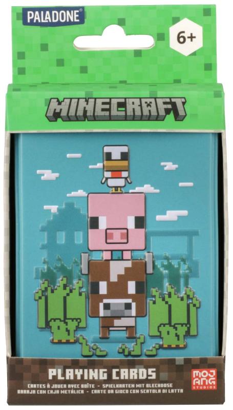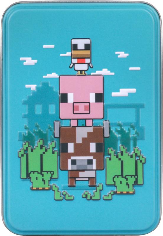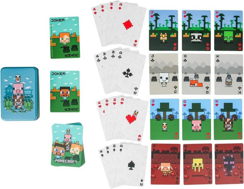 Uvnitř hezké a praktické plechovky najdeš hrací karty se zvířátky a dalšími postavami z kostičkového světa videohry Minecraft. Zahraj si svou oblíbenou karetní hru, ať už doma s rodinou nebo třeba na cestách s přáteli! Krabička obsahuje 52 karet (+2 žolíci).