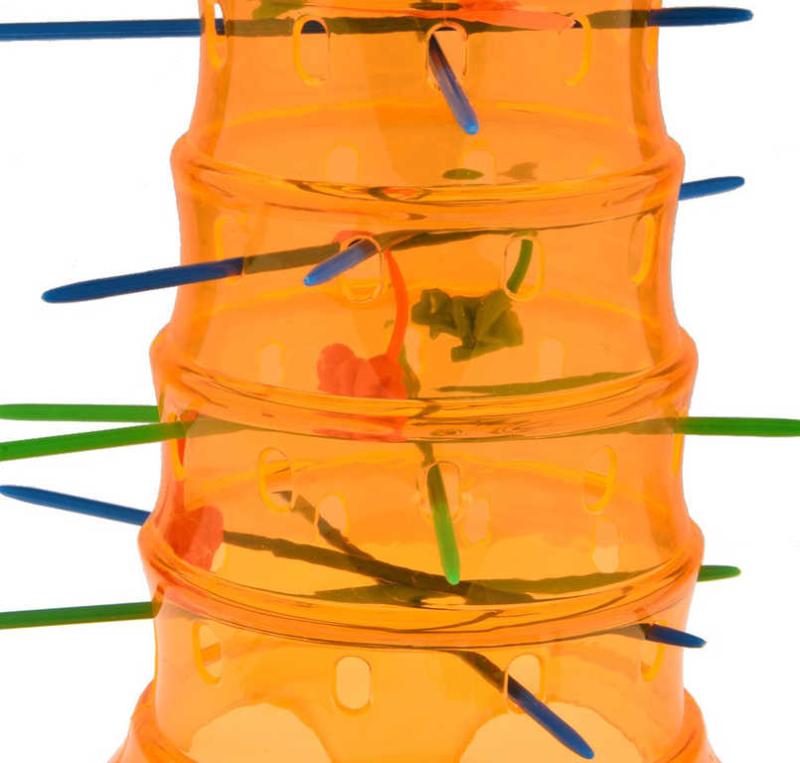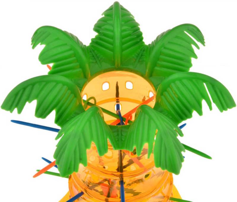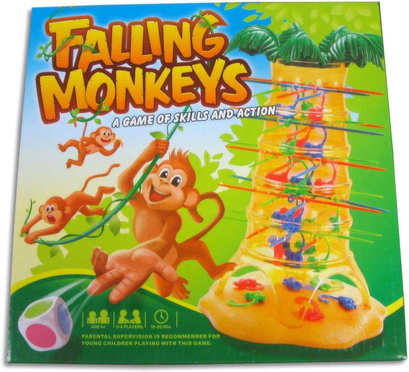Padající opičky obsahují průhlednou palmu, do které se postupně dle libosti zastrkávají tyčinky. Poté se ze shora palmy pustí dovnitř malé opičky, které se o tyčinky zaháknou svými ocásky. Vašim úkolem je vytahovat postupně tyčinky tak, aby opička nepropadla dolu. Vypadlá opička je vlastně trestným bodem, takže vítězem hry je ten, který má po vypadnutí všech opiček nejméně opiček.