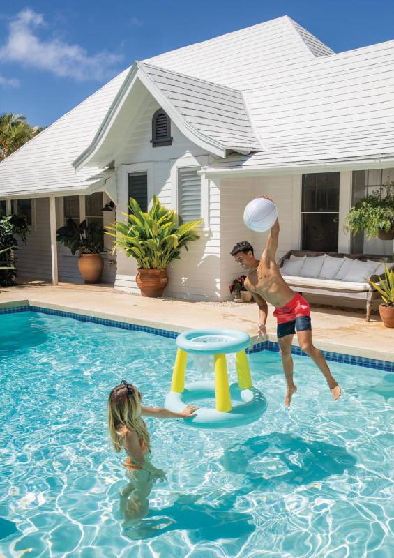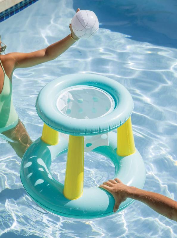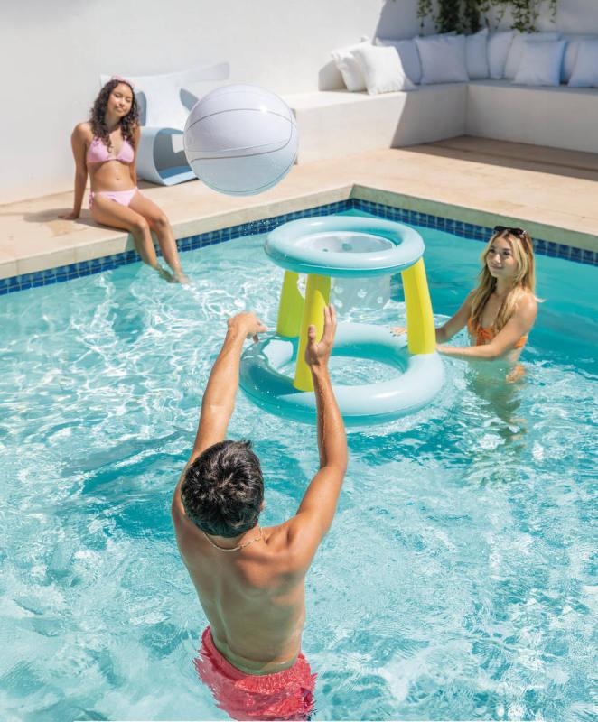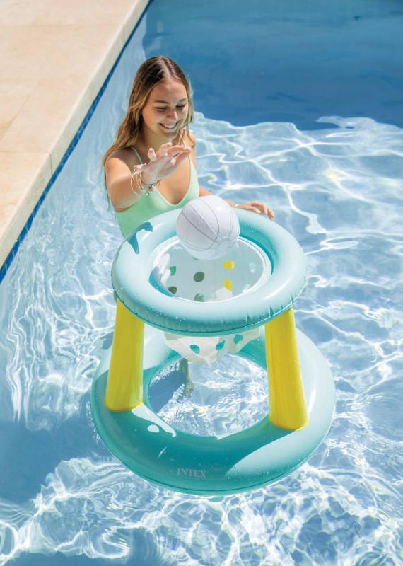 Basketbalový koš je navržen tak, aby volně plaval na hladině bazénu a umožňoval pohodlnou hru přímo ve vodě. Jeho konstrukce je tvořena dvěma nafukovacími kruhy v pastelově modré barvě, mezi kterými jsou tři pevné žluté sloupky, které zajišťují stabilitu a pevnost. Koš je doplněn o síťku z bílého materiálu s pravidelně rozmístěnými kruhovými otvory, která je připevněna pod horním kruhem a slouží k zachytávání míče. Součástí balení je i nafukovací basketbalový míč ve stejné bílé barvě s šedými linkami, který je dostatečně lehký a plave na vodě, což usnadňuje hru a zvyšuje zábavu. Díky svému kompaktnímu designu a světlým barvám je hra dobře viditelná na vodní hladině a snadno se stává středem pozornosti během bazénových aktivit. Nafukovací koš je vybaven vzduchovým ventilem, který umožňuje rychlé a jednoduché nafouknutí i vyfouknutí, což usnadňuje jeho přenášení a skladování. Hra je vhodná nejen pro děti, ale i pro dospělé, kteří chtějí zpestřit vodní radovánky a soutěžit v házení na koš. Je to praktická a zábavná pomůcka pro letní sportovní aktivity ve vodě, která podporuje pohyb a koordinaci, a zároveň přináší hodiny zábavy v bazénu.