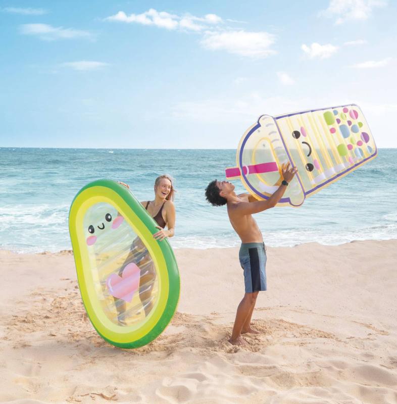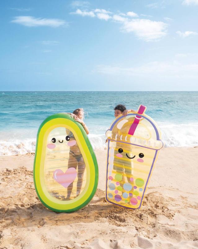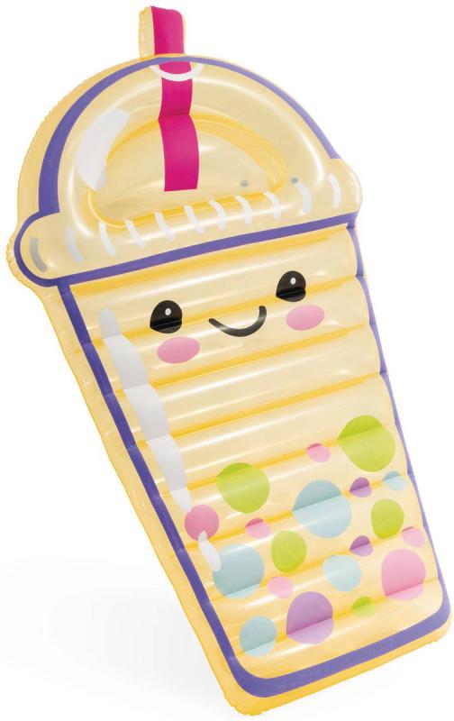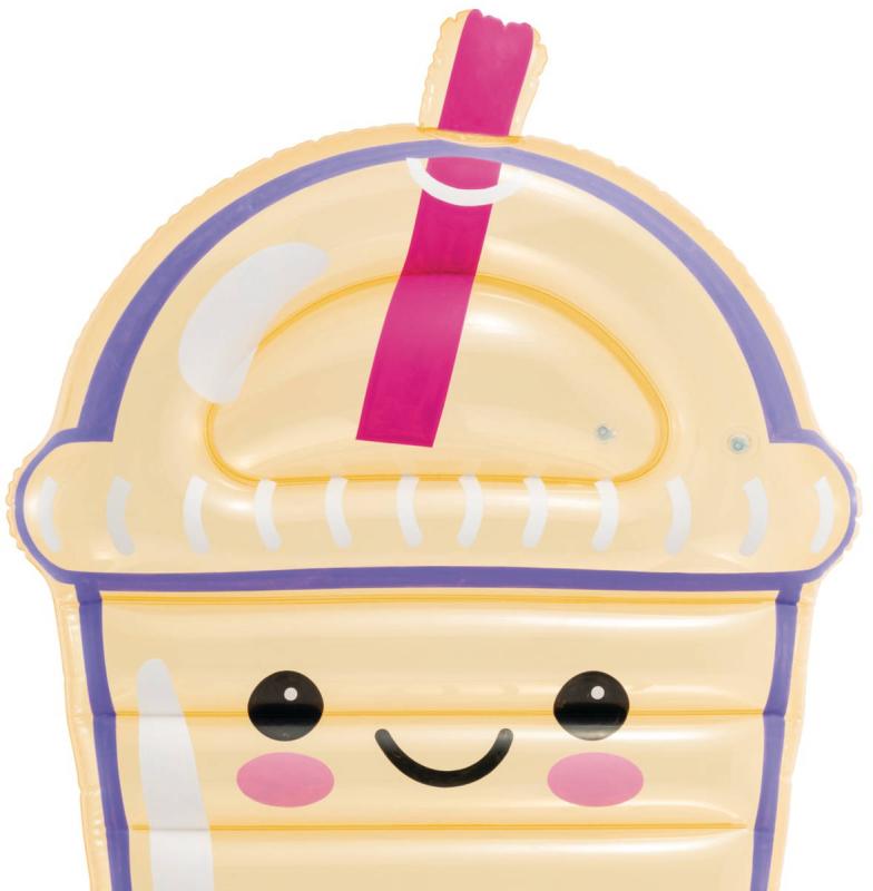 Lehátko je vyrobeno z kvalitního PVC materiálu, který je transparentní a barevně sladěný tak, aby věrně připomínal oblíbený nápoj bubble tea. Celý design doplňuje veselý obličej s černýma očima a růžovými tvářemi, který lehátku dodává hravý a přátelský výraz. Tvar lehátka je charakteristický svou podobou kelímku na bubble tea, včetně víčka a růžové brčka, které z něj vytváří rozpoznatelný a zábavný motiv. Na spodní části lehátka jsou zobrazeny barevné bublinky, které evokují perly v nápoji. Transparentní části lehátka umožňují vidět skrz, což lehátku dodává lehkost a zajímavý vizuální efekt. Tento produkt je určený k pohodlnému ležení na vodní hladině, ale může být využit i jako zábavná rekvizita při hrách na pláži.