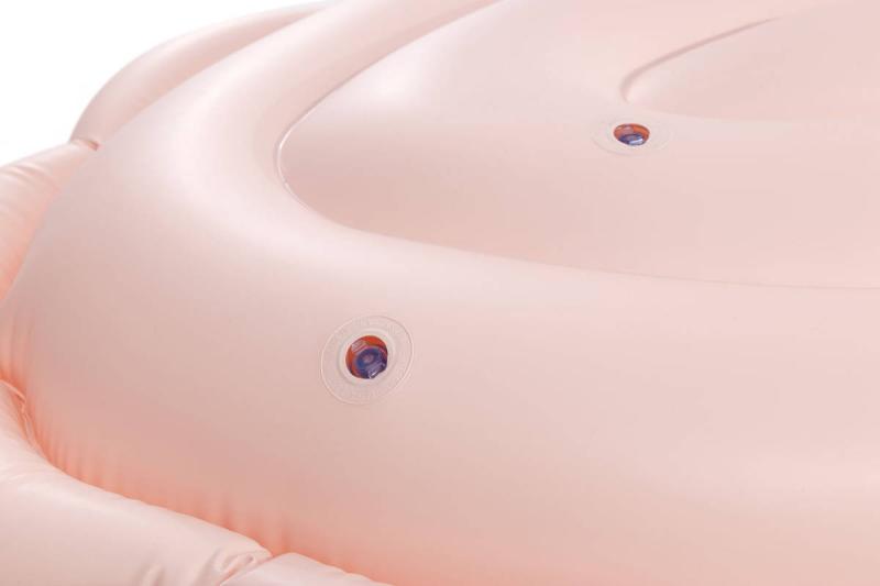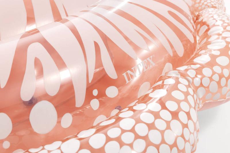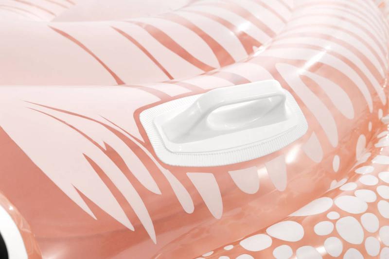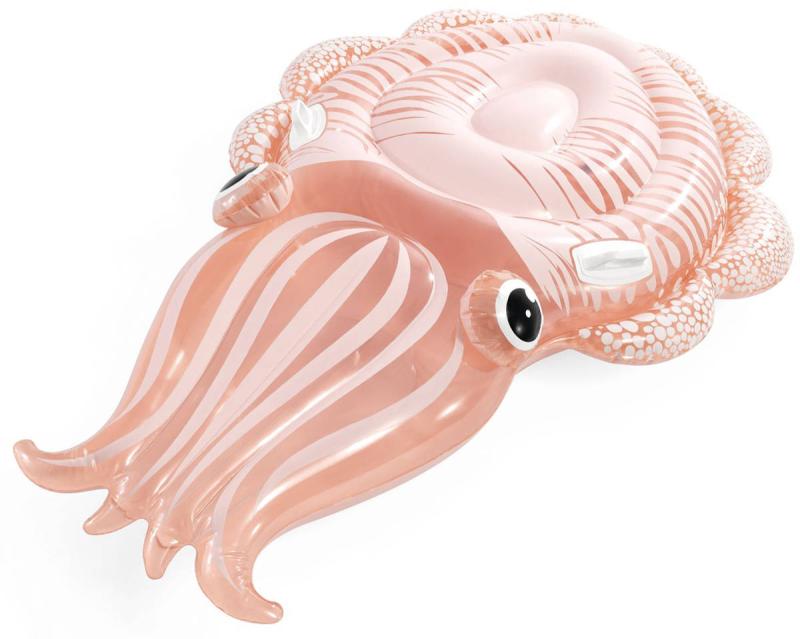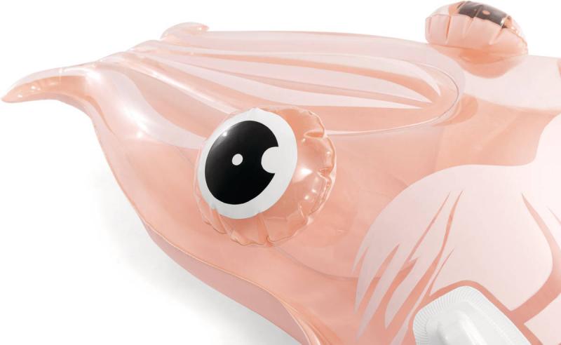 Tento model je vyroben z kvalitního průhledného PVC materiálu, který je lehký, ale zároveň odolný vůči poškození. Lehký průhledný odstín růžovo-oranžové barvy s jemným vzorem připomínajícím skutečnou sépii dodává produktu atraktivní vzhled a zároveň dobře zapadá do letního prostředí bazénů či vodních ploch. Lehátko je tvarováno velmi detailně, s výraznými nafukovacími očima a charakteristickými detaily těla sépie, které zvyšují jeho vizuální atraktivitu. Pro lepší stabilitu a bezpečnost jsou na povrchu lehátka dvě pevná plastová madla, opatřená bílými úchyty, které usnadňují držení a zlepšují kontrolu nad lehátkem ve vodě. Díky nim se děti mohou cítit jistěji a bezpečněji při plavání nebo lenošení na vodě. Funkčně je lehátko vybaveno dvěma vzduchovými komorami s bezpečnostními ventily, které usnadňují rychlé nafouknutí i vyfouknutí a minimalizují riziko úniku vzduchu. Díky své velikosti a tvaru poskytuje dostatek prostoru pro pohodlné ležení, což umožňuje dětem užít si letní dny ve vodě s maximálním komfortem. Lehátko je součástí sortimentu letních sportovních hraček a vodních pomůcek značky Intex, která je zárukou kvality a bezpečnosti.