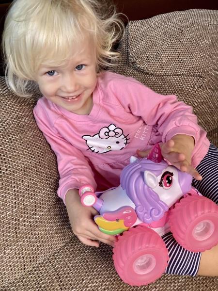 Jednorožec na dálkové ovládání rozhodně nemůže chybět v žádné holčičí garáži. Postará se o pořádnou světelnou show. Díky LED osvětlení mu svítí kola i roh, v rytmu hudby se barvy i tempo různě střídá. Veselá a návyková melodie rozzáří každý úsměv. Pro rodiče ale máme tajnou informaci, na dálkovém ovládání stačí dlouze podržet kulaté tlačítko a melodie přestane hrát :)