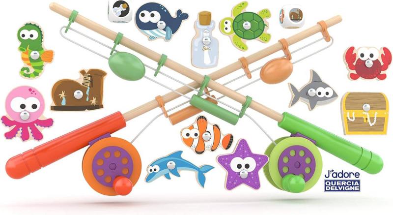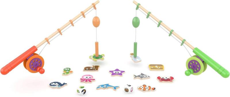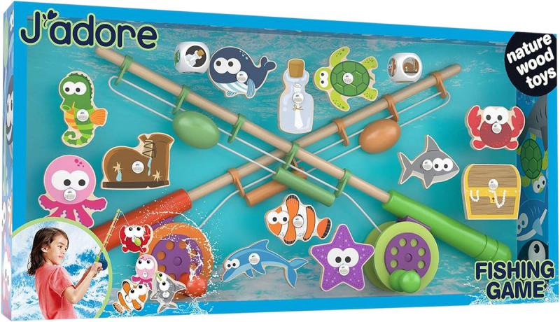 Hračka z přírodního dřeva. Jste připraveni vyrazit na ryby? Tato sada obsahuje 2 rybářské pruty, 9 dřevěných mořských tvorů a 3 další předměty z ulovení. Děti mohou pomocí dřevěného prutu chytat magnetické dřevěné rybky. Rybářská výprava může začít! Pro malé rybáře od 3 let. Hra rozvíjí koordinaci, obratnost a motoriku.
