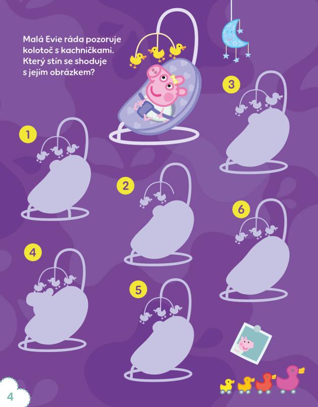 1000 samolepek s aktivitami v licenci Prasátko Peppina. Sešit obsahuje 48 stran plných zábavných aktivit pro předškolní děti a 1000 samolepek k dolepení.Prasátko Pepina je britský dětský animovaný televizní seriál. Příběh je o malém prasátku Peppě a její rodině a přátelích. Každý její kamarád představuje jiný druh savce. Peppini kamarádi jsou stejně staří jako ona. Peppa má mladšího bratra Toma. Příběhy jednotlivých dílů představují každodenní aktivity jako chození do školky, návštěvu prarodičů, jízdu na kole nebo nakupování. Postavy nosí oblečení, žijí v domech, řídí auta, ale stále si zachovávají některé charakteristické vlastnosti zvířat, jež představují. Peppa a její rodina během rozhovoru chrochtá, ostatní zvířata dělají odpovídající zvuky, když mluví.