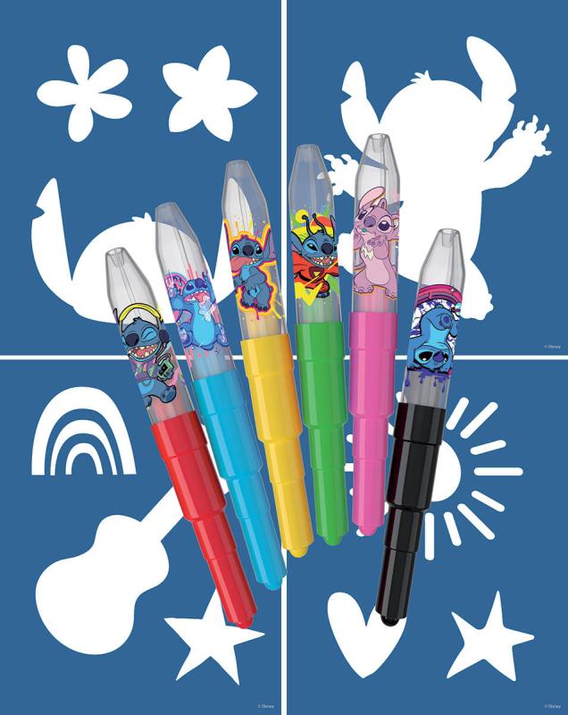 JIRI MODELS Fixy foukací 6ks Lilo & Stitch set se 4 šablonami.Kreativní sada obsahující 6 barevných foukacích fixů s potiskem a 4 barevné papírové šablonky v oblíbených pohádkových motivech. Děti se s touto sadou mohou pustit do obrázků vytvářených technikou foukání,
