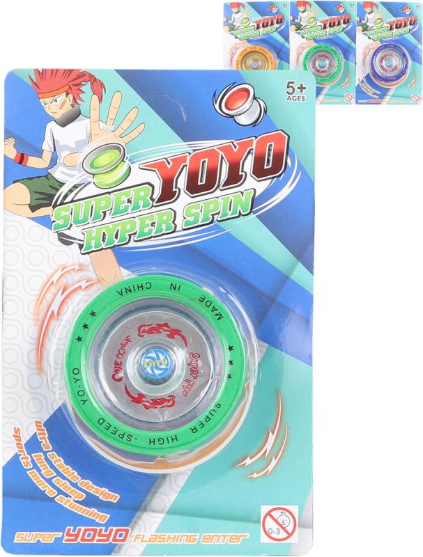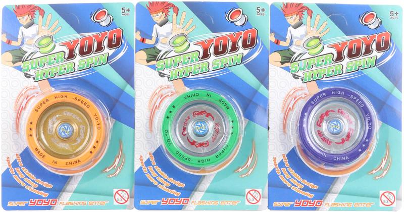 Klasická dětská hračka jo-jo z kovu a plastu, ve třech barevných variantách. Baleno na kartě.