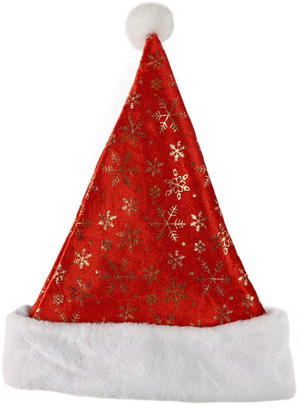 Červená vánoční santovská čepice Santa Claus se zlatými sněhovými vločkami, velikost 40cm, vhodné také jako doplněk ke kostýmu na karneval.