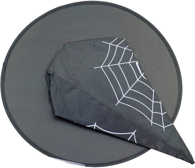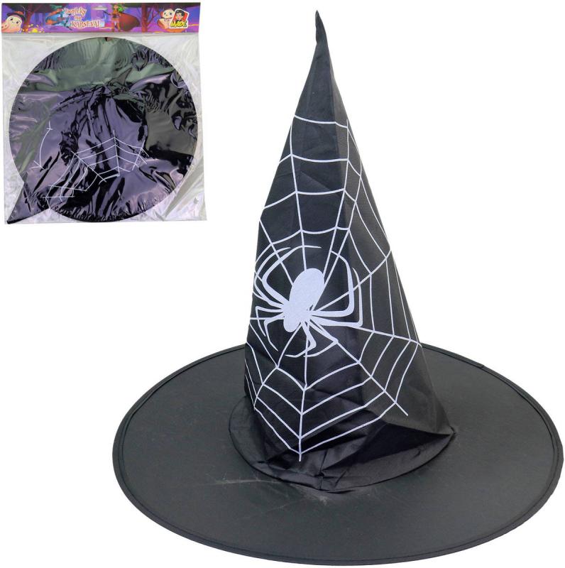 Špičatý černý klobouk pro čarodějnice a čaroděje. Bílý potisk pavučina s pavoukem, doplněk ke kostýmu Čarodějnice, na karneval.Karneval neboli masopust (v původním slova smyslu "opuštění masa" (slovo karneval pochází nejspíš z italského carne levare, "dát pryč maso"), tedy začátek postního období před Velikonocemi. Karnevalový rej
