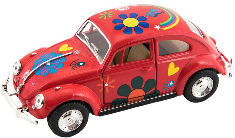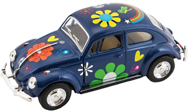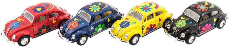 KINSMART KT5057 VOLKSWAGEN CLASSICAL BEETLE 1967: Krásný věrný kovový model (detailní kopie) - dětské kovové retro autko "brouk" z kovu ve čtyřech barevných kombinacích, s veselým květinovým potiskem, s pohonem na zpětné natažení. Má otevírací dveře (dvířka jdou otevírat). Vůz vyroben tlakovým litím z kovové slitiny v kombinaci s plastovými díly.