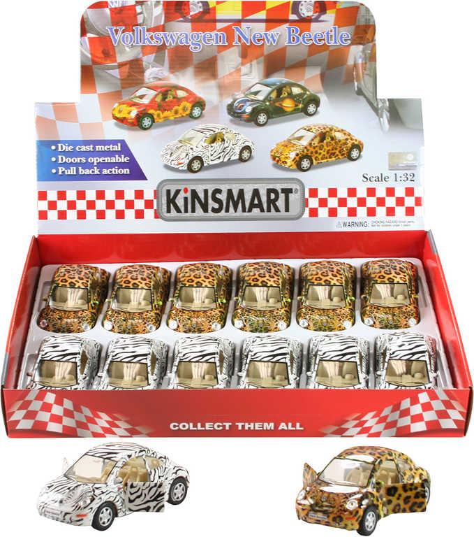 KINSMART VW VOLKSWAGEN NEW BEETLE: Krásný věrný kovový model (detailní kopie) - dětské kovové osobní retro autko "brouk" z kovu se zvířecím maskovacím potiskem, ve dvou variantách provedení. Má otevírací dveře (dvířka lze otevírat). Vůz vyroben tlakovým litím z kovové slitiny v kombinaci s plastovými díly. Na zpětné natažení - pull-back.