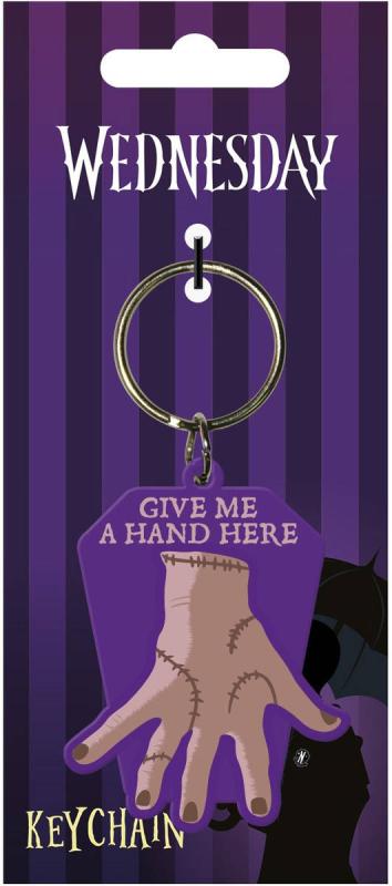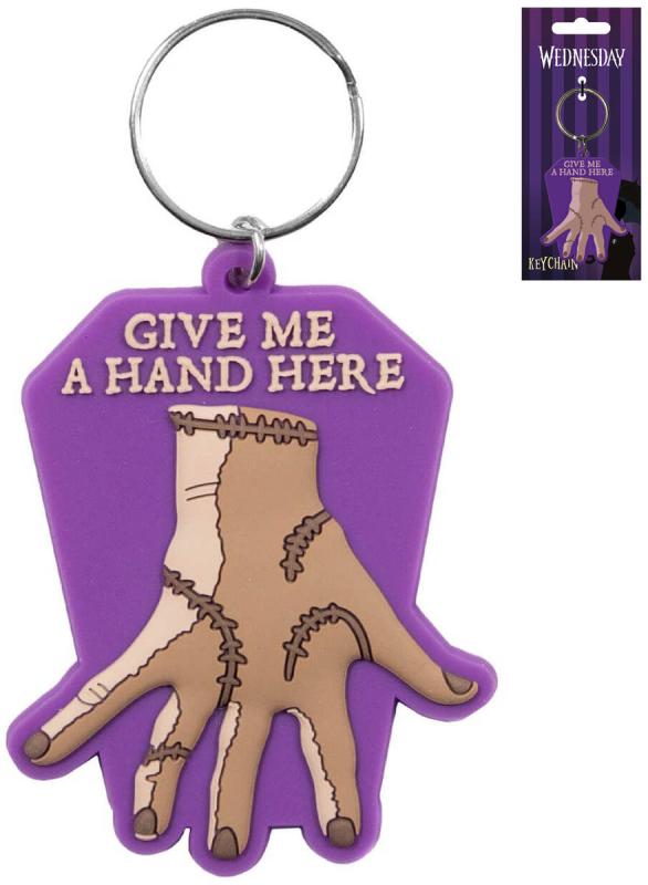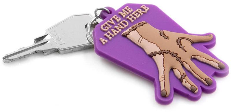 Klíčenka - přívěsek na klíče - z populárního seriálu Wednesday. Na klíčence je ruka Věc, která je věrný pomocník Addamsovy rodiny. Nad klíčenkou je anglický nápis "Give me a hand here". Klíčenka je oficiálně licencovaná.