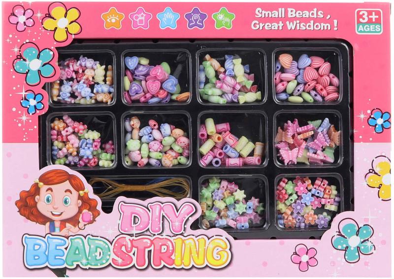 Kreativní set s navlékacími korálky pro všechny šikovné holčičky, které by si rády vytvořily svůj vlastní, originální šperk nebo módní doplněk. Různé velikosti, tvary a barvy korálků (motýlci, hvězdičky, srdíčka, bonbonky, medvídci ... ).