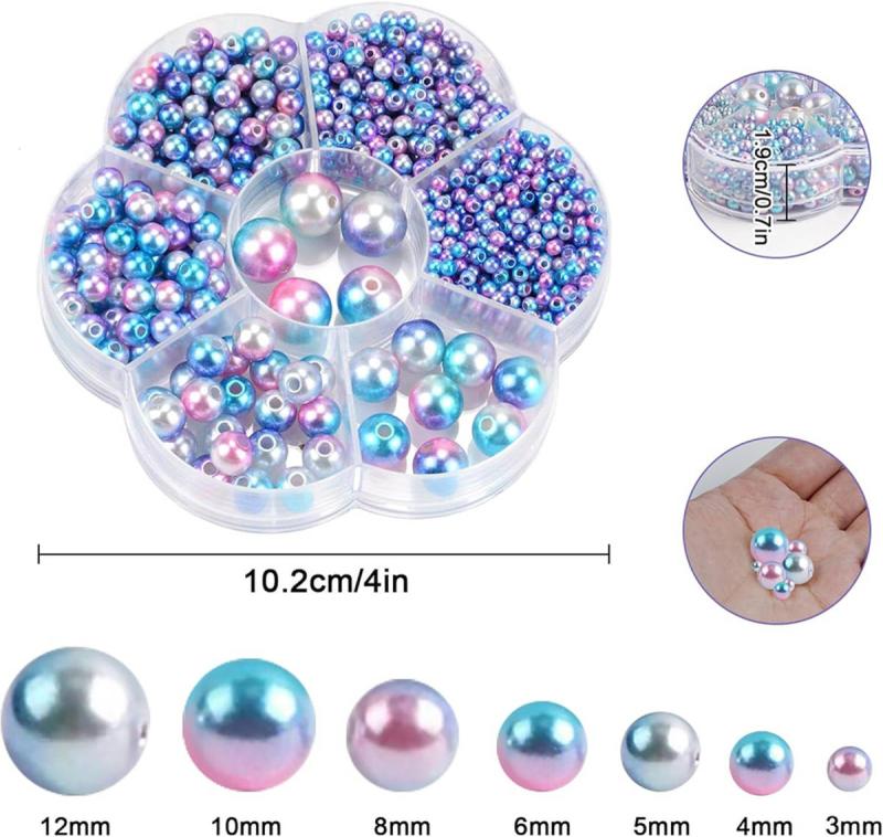 Vícebarevné lesklé perleťové navlékací korálky v modrých odstínech, cca 1150ks, 7 různých velikostí, průměr 3mm - 12mm, kvalitní plast, průhledná krabička s přihrádkami.Korálky jsou vyrobeny z vysoce kvalitního plastu s hladkým povrchem a perleťově lesklým vzhledem. Odolný materiál, který neztrácí barvu. Korálky jsou uloženy v průhledné krabičce s víkem, které se snadno otevírá a zavírá, takže je lze snadno vyjmout a uložit. Barevné korálky jsou ideální pro výrobu šperků, výplň váz, květinové dekorace, svíčky a další řemeslné výrobky. Tyto umělé korálky jsou vhodným doplňkem pro dekorace a řemeslné výrobky.
