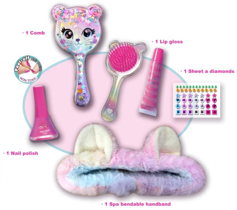 Zábavný kosmetický set obsahuje vše důležité pro váš den plný kosmetické péče. V balení najdete plyšovou čelenku, hřebínek s flitry, lesk na rty, slupovací netoxický lak na nehty, 1 arch lepicích ozdobných kamínků. Vhodné pro děti 6ti let.