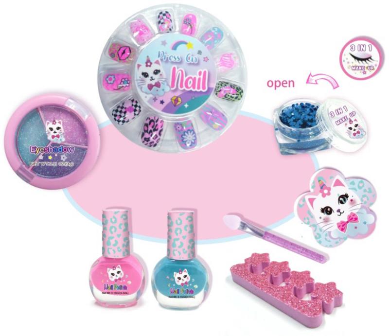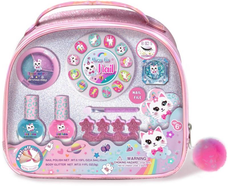 Dětský kosmetický set s taškou an zip a přívěškem. V balení najdete třpytky na tělo a obličej, nalepovací barevné nehty, oční stíny, pilníček na nehty, 2 laky na nehty, odělovač prstů pro lakování nehtů. Vhodné pro děti do 6ti let.