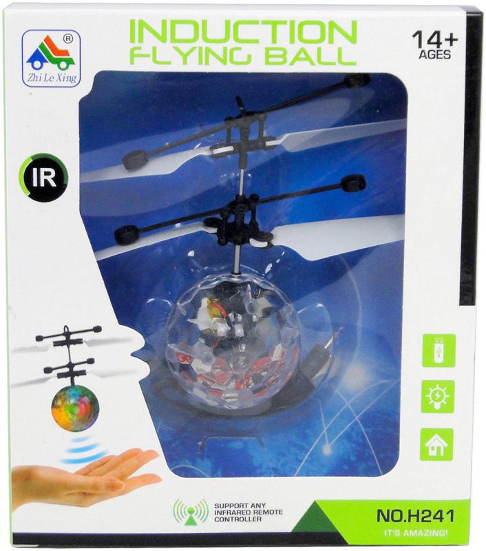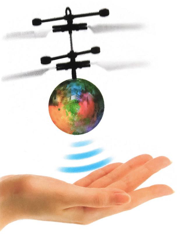 Vrtulníková, ručně ovládaná koule se zabudovaným čidlem nabízí možnost ovládat její let pomocí dlaně. Děti mohou rukou určovat výšku letu. Za letu koule svítí. Balení obsahuje také USB kabel pro rychlé dobíjení. Hračkana baterie, se světlem. Baleno v krabici.