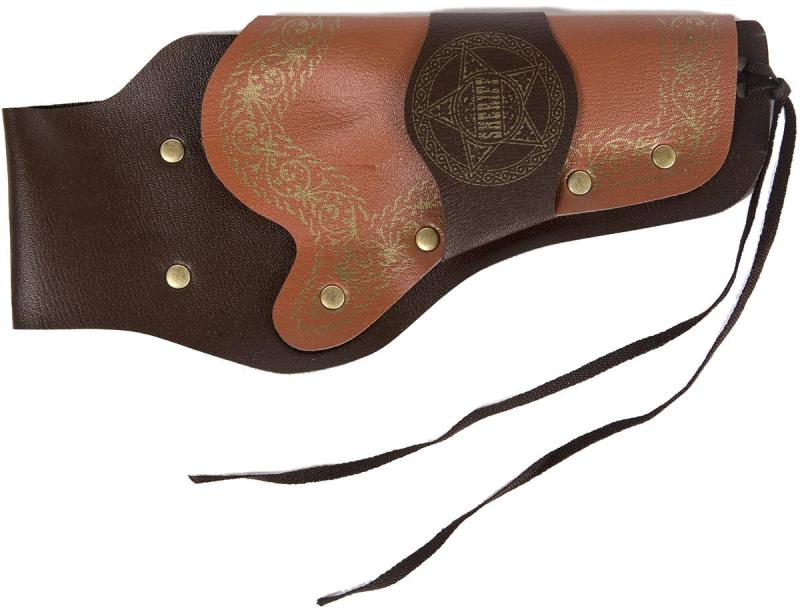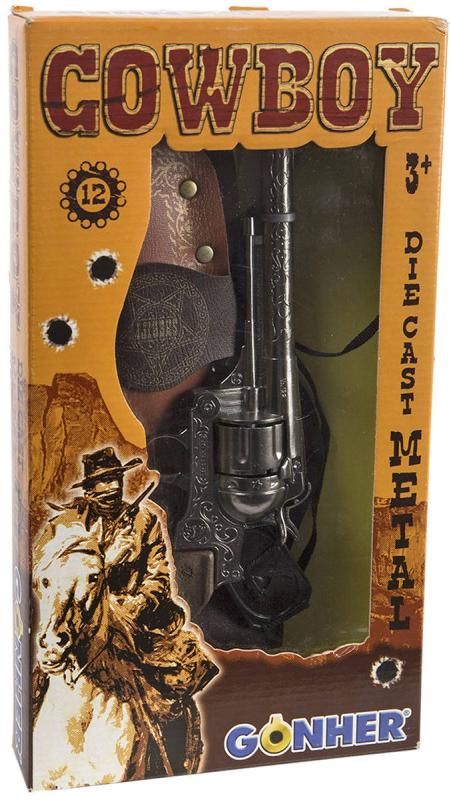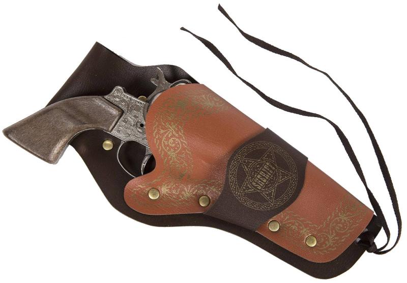 Tato dětská kovbojská sada nesmí chybět ve výbavě malého pistolníka Divokého západu. S kovovou zbraní v pouzdře a opaskem si může hrát s kamarády na kovboje a šerifa, hlídajícího pořádek ve městě. Revolver je na kapslíky a je možné vystřelit dvanáct ran. Přestřelka může začít! Hmotnost revolveru je podobná skutečné zbrani. Výrobek se vyznačuje vysokou kvalitou a důrazem na detail. Rostlinný ornament.