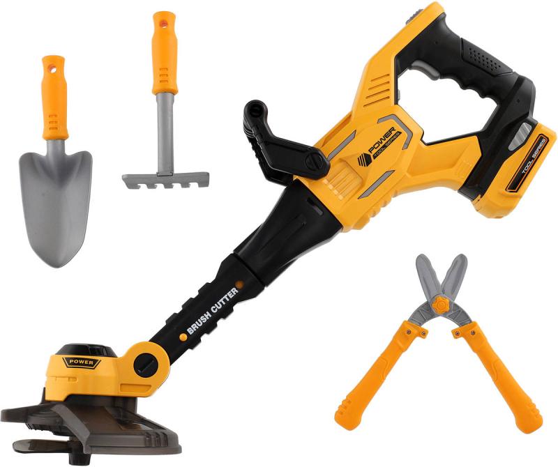 Plastový křovinořez. Dětské pracovní zahradnické nářadí. Realistické provedení. Součástí lopatka, hrábě a zahradnické nůžky. Hračka na baterie, se světlem a zvukem.