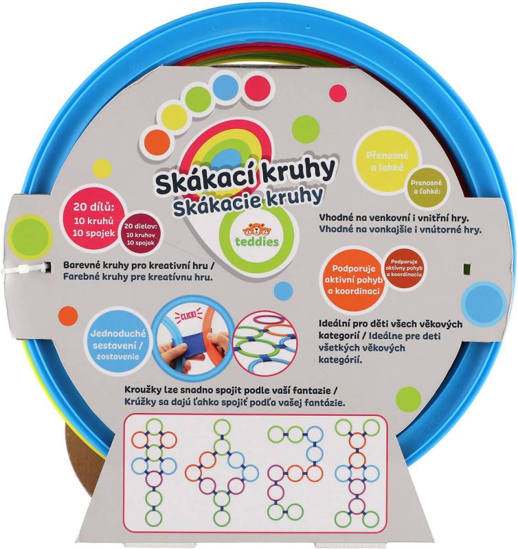 Skákací kroužky Hop - Skoč! 27cm. Spoj kroužky do různých obrazců a pokus se je proskákat. Balení obsahuje 10 různobarevných kroužků a 10 spojek (easy click).Sada plastových kroužků v různých barvách je ideální pomůckou do hodin tělesné výchovy, ke zlepšení fyzické zdatnosti, procvičení koordinace celého těla. Děti mohou skákat z jednoho kroužku do druhého nebo pouze do kroužků jedné konkrétní barvy, mohou si s kroužky házet, obíhat je a další. Skákací kroužky lze používat uvnitř i venku, jsou vhodné do školek, škol, školních družin i volnočasových zařízení.