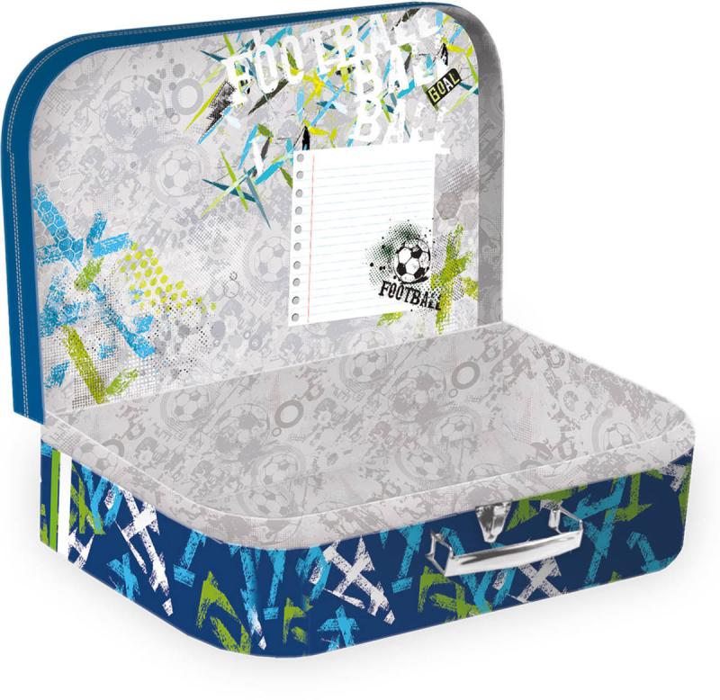 Dětský papírový kufřík s motivem Fotbal o velikosti 35 x 25 x 10cm, kovové ouško a zapínání, pevný karton. Školní lepenkový kufr s vnitřním potiskem.Papírový dětský kufřík velikosti 35cm s fotbalovým motivem. Kufřík je vyroben z kvalitního pevného kartonu s vnitřní potiskem a kovovým uzavíráním s rukojetí. Je vhodný na školní potřeby, výtvarné potřeby, vejde se do něj i blok barevných papírů A4. Jeho využití v dětském světě je velké ... možnost uložení hraček ale i jiných drobností na cestu k babičce.