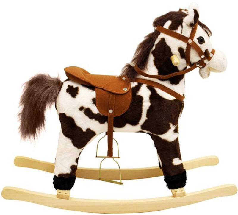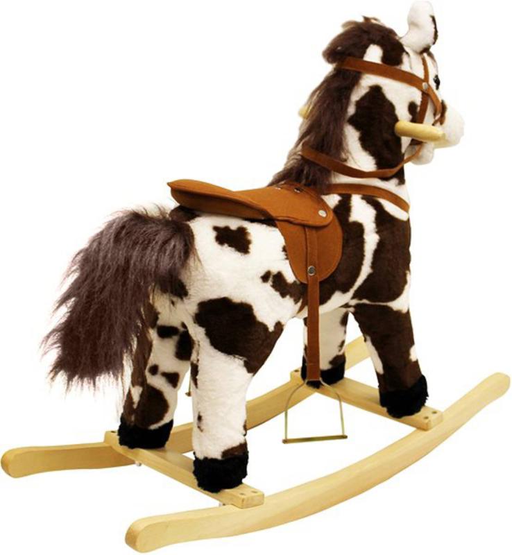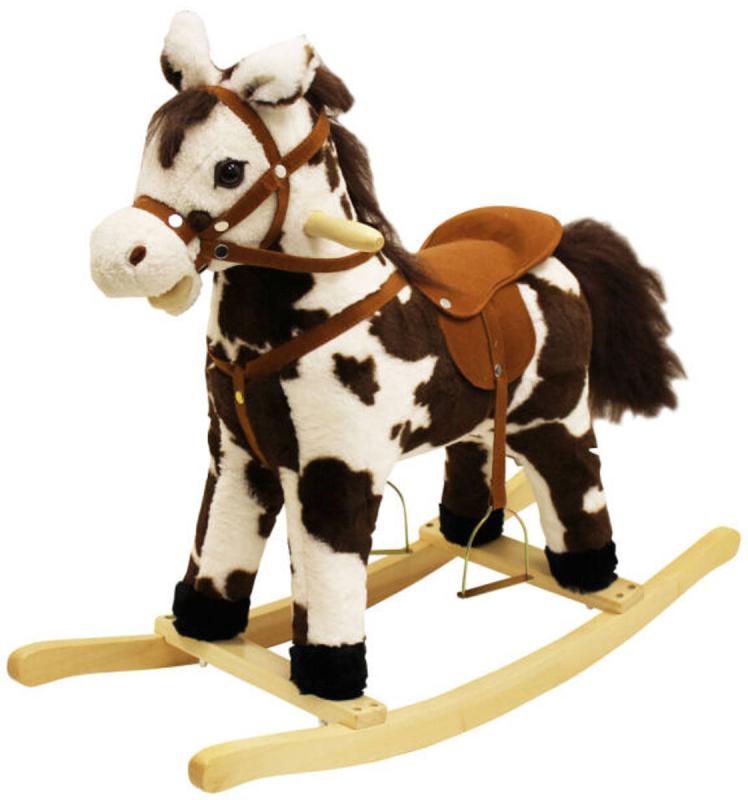 Hnědobílý strakatý houpací kůň ze dřeva a plyše. Klasická, tradiční hračka na baterie, se zvukem.Houpací koník potěší všechny malé děti! Krásný strakatý koník vydává zvukové efekty, které se aktivují tlačítkem ukrytým v oušku. Přihrádka na baterie se nachází na břiše koně.