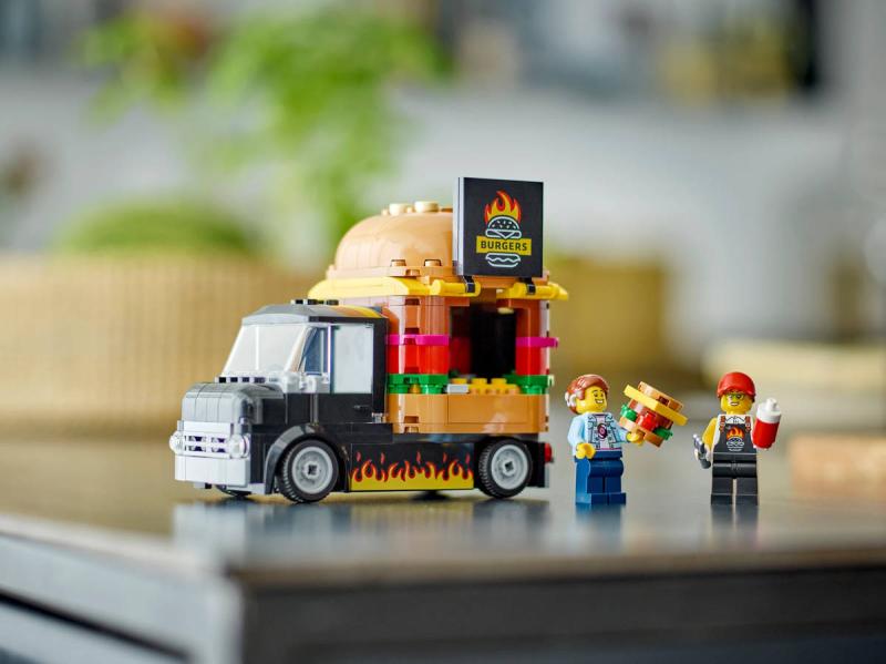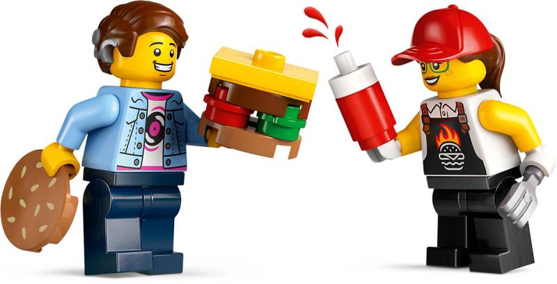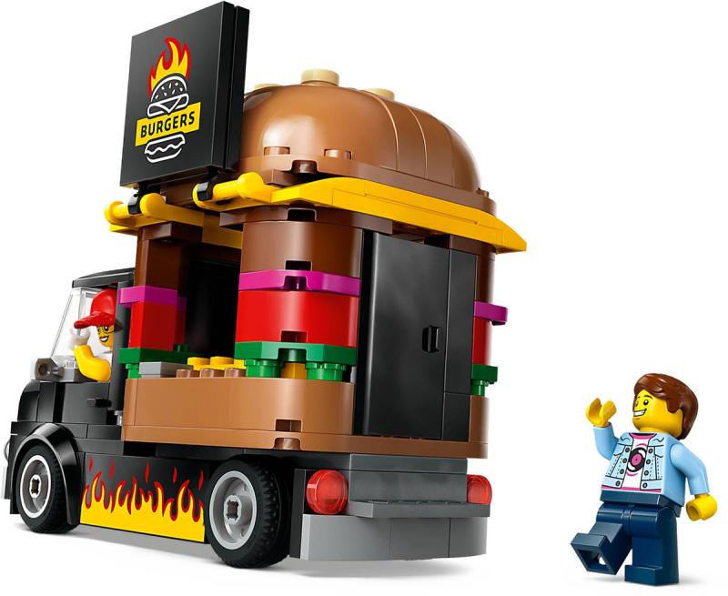 Stavebnice Hamburgerový truck rozproudí fantazii malých stavitelů od 5 let. Střechu pojízdné prodejny hamburgerů zdobí obří burger a propracovaný prostor na přípravu jídla s řadou omáček a dochucovadel lze vyjmout. Zvedněte dvířka a odhalte ceduli s burgerem grilovaným na ohni. Součástí stavebnice je také minifigurka prodejce a zákazníka s naslouchátkem. Návod na stavění modelu LEGO City Hamburgerový truck najdete v krabici – nebo si stáhněte aplikaci LEGO Builder, která dětem umožní prozkoumávat a ukládat si virtuální stavebnice, sledovat postup stavění a přibližovat, otáčet a prohlížet si modely ze všech úhlů, zatímco na nich pracují.