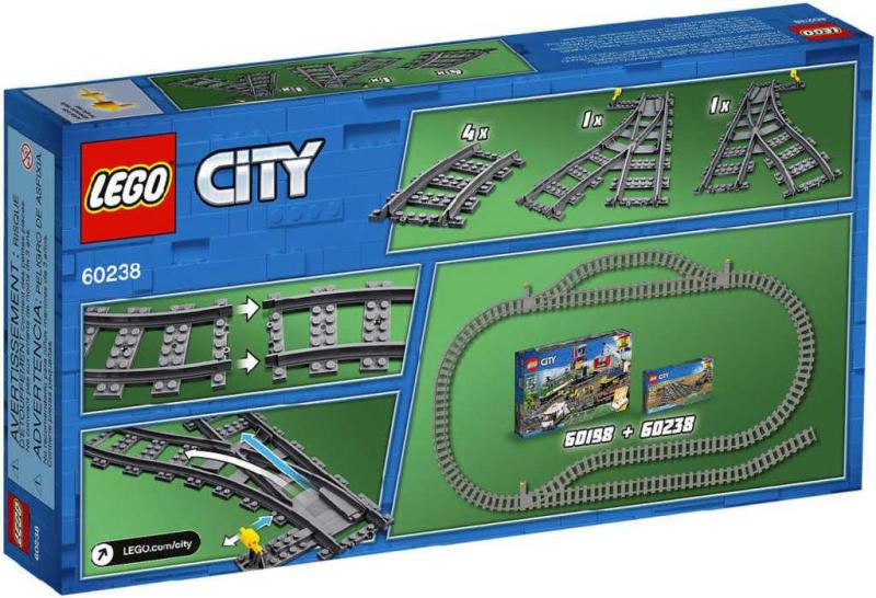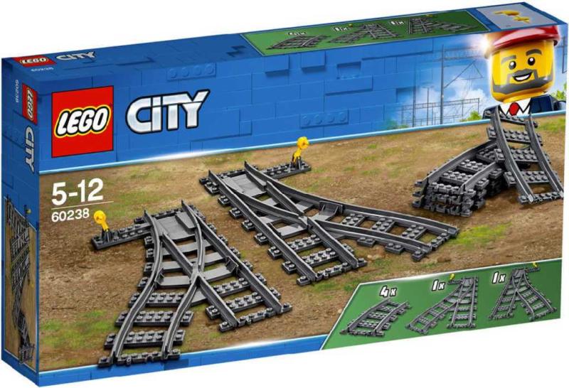 LEGO 60238 - Výhybky a zahnuté koleje z produktové řady LEGO CITY - Plastové doplňky k vláčkodráhám od Lega v krabici.