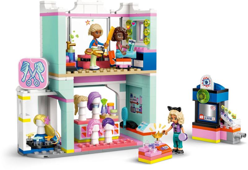 Děti od 7 let si se stavebnicí Kadeřnictví a obchod s doplňky užijí spoustu zábavy. Tato stavebnice se skvěle hodí pro holky a kluky, kteří milují doplňky, a obsahuje 3 minipanenky LEGO Friends a spoustu vlasových doplňků prokreativní hraní. Tato stavebnice vypráví příběh kamarádek Novy a Aliyi, které si užívají den plný zábavy při zkoušení nových účesů s kadeřníkem Farajim. Nahoře v dvoupatrové budově najdete kadeřnický salon s křesly, fény, kartáči a parukami, které si kamarádky vyzkouší. V přízemí se nachází obchod s dalšími parukami a zábavnými doplňky, které postavám dodají nový vzhled. Děti umístí postavičky do fotokoutku, ze kterého vyjedou fotky Aliyi a Novy. Součástí stavebnice je také otáčející výloha, rampa na brusle, kolečkové brusle a helma.