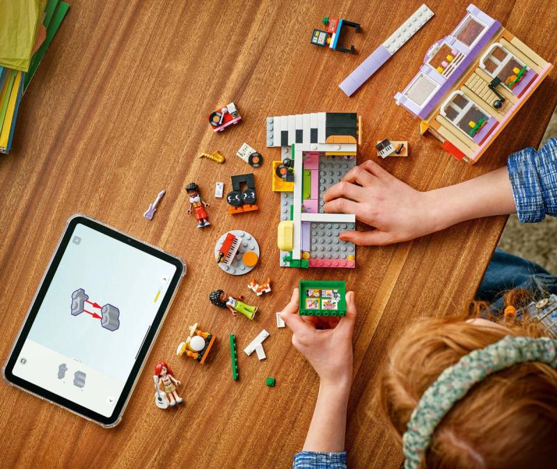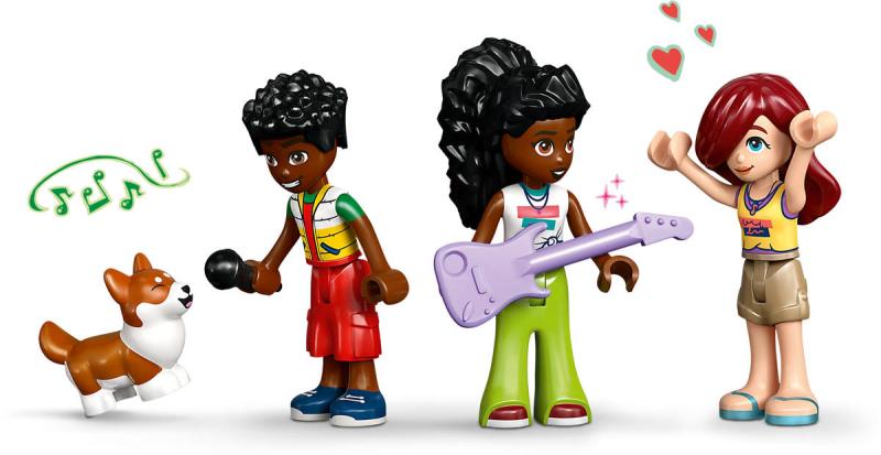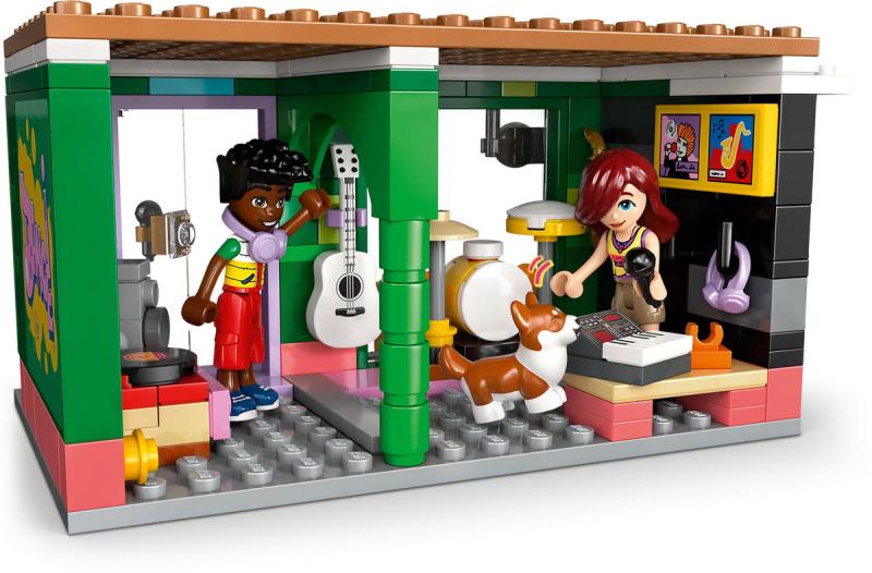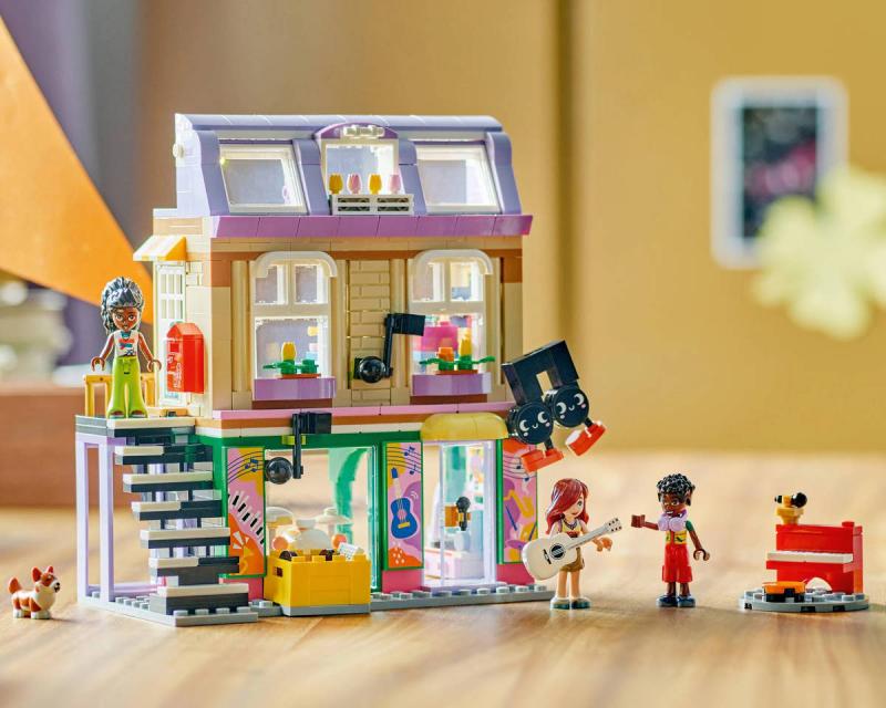 Připravte se na překrásné tóny s touto stavebnicí s hudební tematikou. Stavebnice Obchod s hudebninami a byt pro holky, kluky a milovníky hudby od 7 let obsahuje 3 minipanenky LEGO Friends, figurku corgiho a doplňky, které inspirují k nápaditému hraní. Děti si poslechnou hudbu s Paisley, Zacem a Elsou D a prozkoumají různé nástroje v obchodě s hudebninami, včetně bicích, kytary a saxofonu. Nechybí pouliční piano, u kterého corgi Marimba rád "zpívá" do mikrofonu. Pestrobarevná budova je zdobená zábavným odnímatelným maskotem v podobě noty a nechybí schodiště s motivem klavíru, které vede do útulného bytu Elsy D. Byt je plný krásných detailů, včetně dvířek pro psa, pelíšku pro psa, poštovní schránky, kuchyňky, psacího stolu a žebříku vedoucího k posteli v podkroví. Tato propracovaná stavebnice obsahuje také spoustu doplňků, včetně gramofonu, syntezátoru a sluchátek, se kterými si děti zahrají na různé společenské situace.