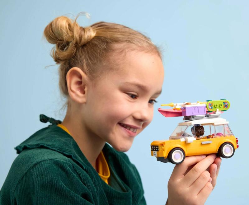 Vstupte do světa dobrodružství se stavebnicí Výlet v autě s přáteli pro holky a kluky od 6 let. Tato akcí nabitá stavebnice obsahuje model auta s přívěsem, 2 minipanenky LEGO Friends, roztomilou figurku štěňátka a spoustu doplňků, které inspirují k zábavnému hraní. Vydejte se s dětmi na kreativní cestu a pomozte Liann a Aliye naložit do auta a odnímatelného přívěsu vše, co potřebují na cestu. Kamarádky sedí vepředu – vzadu v autě je sedadlo pro pejska Airu. Mezi doplňky najdete kajak, 2 helmy, skateboard, kolečkové brusle, 2 židle a chladicí box se sendvičem, donutem, sušenkou, třešněmi a pamlsky pro psa. Až přijde čas na svačinu, chladicí box poslouží i jako piknikový stůl.