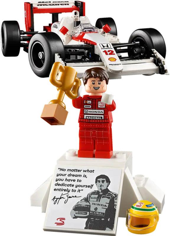 Potěšte fanoušky závodních aut stavebnicí McLaren MP4/4 a Ayrton Senna. Sada byla navržena ve spolupráci s automobilkou McLaren a značkou SENNA a nechybí jí autentické detaily, díky kterým model dokonale připomíná legendární předlohu z roku 1988, jež se řadí mezi nejúspěšnější závodní vozy F1 vůbec. Součástí stavebnice je také výstavní minifigurka Ayrtona Senny. Součástí modelu vozu McLaren MP4/4 je funkční řízení, spojovací tyč, upravitelné zadní křídlo, hladké pneumatiky, zrcátka, řadicí páka a propracovaný turbomotor V6. Nechybí podstavec na vystavení a cedulka se zajímavými statistikami. Minifigurka Ayrtona Senny má vlastní podstavec na vystavení s informacemi, slavným citátem a fotografií Ayrtona Senny.