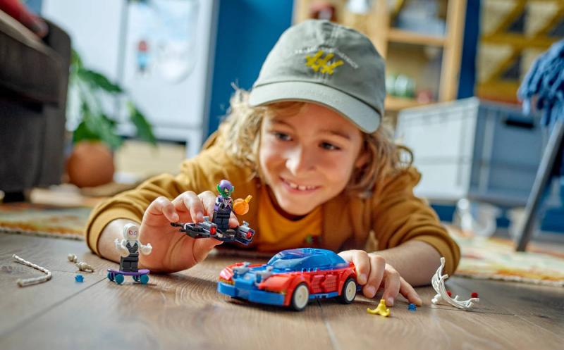 Fanoušci akčních superhrdinů, minifigurek Marvel a super vozidel si přímo zamilují tuto stavebnici z řady LEGO Marvel se Spider-Manovým autem, kluzákem Zeleného goblina a skateboardem Ghost-Spider. Spider-Manovo závodní auto a Venom Zelený goblin představuje stylový dárek pro děti od 7 let. Spider-Man, Ghost-Spider a Venom Zelený goblin se utkají v rychlé akční bitvě s řadou vozidel, zbraní a doplňků. Spider-Manovo auto má 2 přední vystřelovače, Zelený goblin se pyšní 2 vystřelovači na kluzáku a dýňovými bombami a Ghost-Spider při jízdě na skateboardu používá 2 ruční vystřelovače pavučin. Spider-Man se houpe na ohebném pavučinovém "laně" a pomocí velké pavučiny uvězní padouchy. Odnímatelné části stavebnice umožňují přístup do interiéru auta, do kterého se vejdou hned 2 minifigurky a skateboard. Pro ještě více digitální zábavy je zde zábavná a intuitivní aplikace LEGO Builder, kde mohou stavitelé přibližovat a otáčet modely ve 3D a sledovat postup.
