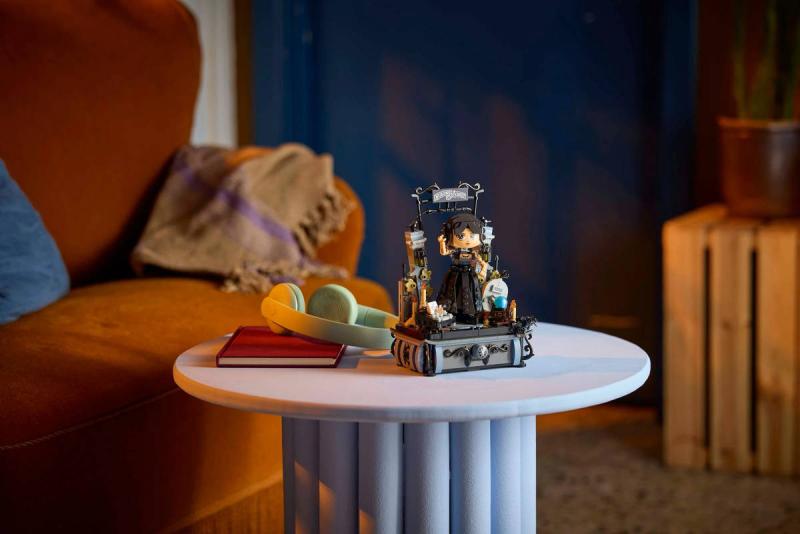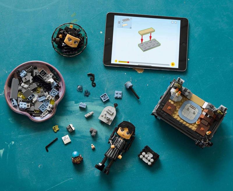 Digitální verzi návodu na stavění najdete v aplikaci LEGO Builder. Na zadní straně základny podstavce na vystavení najdete samolepku s QR kódem, kterou lze naskenovat pro snadný přístup k digitálnímu návodu na přestavení nebo změně oblečení Wednesday. Aplikace umožňuje dětem přibližovat a otáčet modely ve 3D a spoustu dalšího.