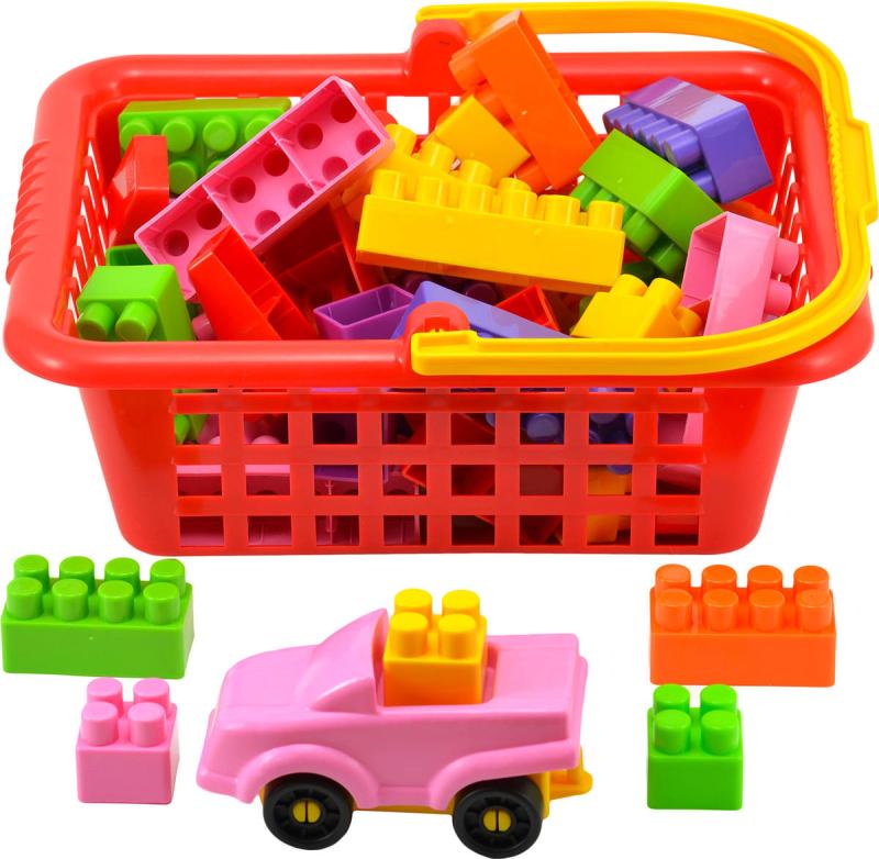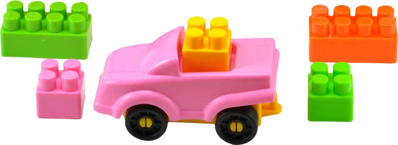 6 typů kostek volených barevně pro malé slečny (růžová, světle zelená, oranžová) + stříšky + růžové autíčko. Baleno v zesílené taštičce. Obsahuje 45 ks kostiček.