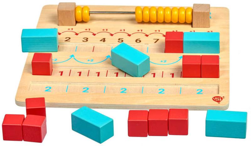 počítadlo a dole 3 obdélníkové drážky. V drážkách je umístěno 10 červených kostek a 5 modrých kvádrů určených k učení základních počtů. Postupujte podle pokynů na desce a jednoduše je umístěte