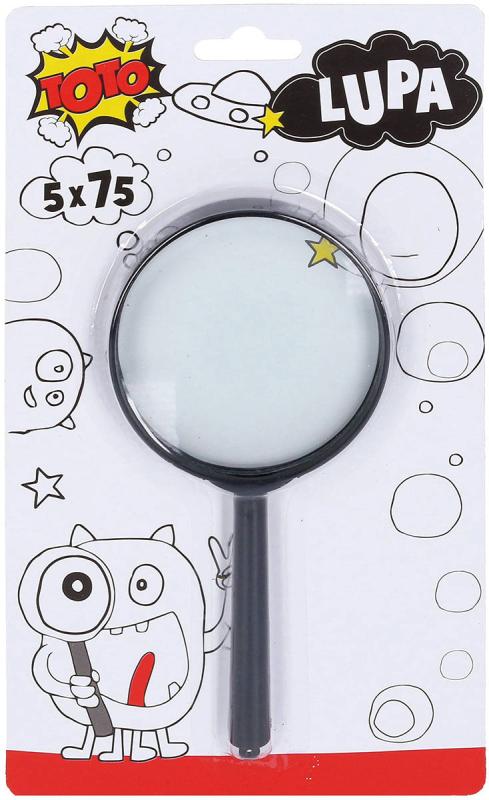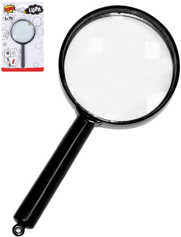 Černá klasická plastová lupa pro děti, zvětšovací sklo pro optické zvětšení pozorovaného objektu nebo textu. Velikost 15cm. Zvětšení 5x75mm.Univerzální lupa na čtení, se kterou přečtete i malá písmenka, číslice a další drobné věci. Baleno na kartě.
