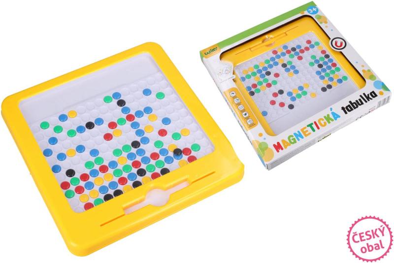 Magnetická tabulka. Velikost 25cm. Pomocí přiložené magnetické tužky se umísťují barevné magnetky na potřebná místa a tvoří se tak libovolný obrázek. Obsahuje předlohy s různými obrázky.