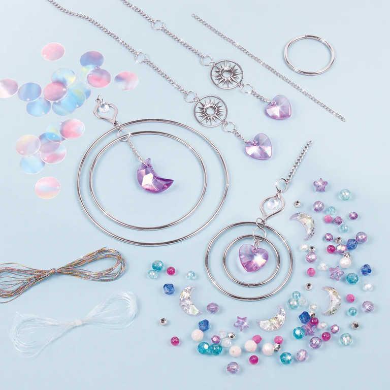 Balení obsahuje: 5 kovových kruhů, 9 řetízků, 4 přívěšky s drahokamy, 2 přívěsky, 2 přívěsky slunce, čirou elastickou šňůrku (3m), kovovou šňůru (3m), 68 různých korálků, 4 korálky ve tvaru hvězdy, 4 korálky ve tvoru měsíce, 20 kulatých flitrů