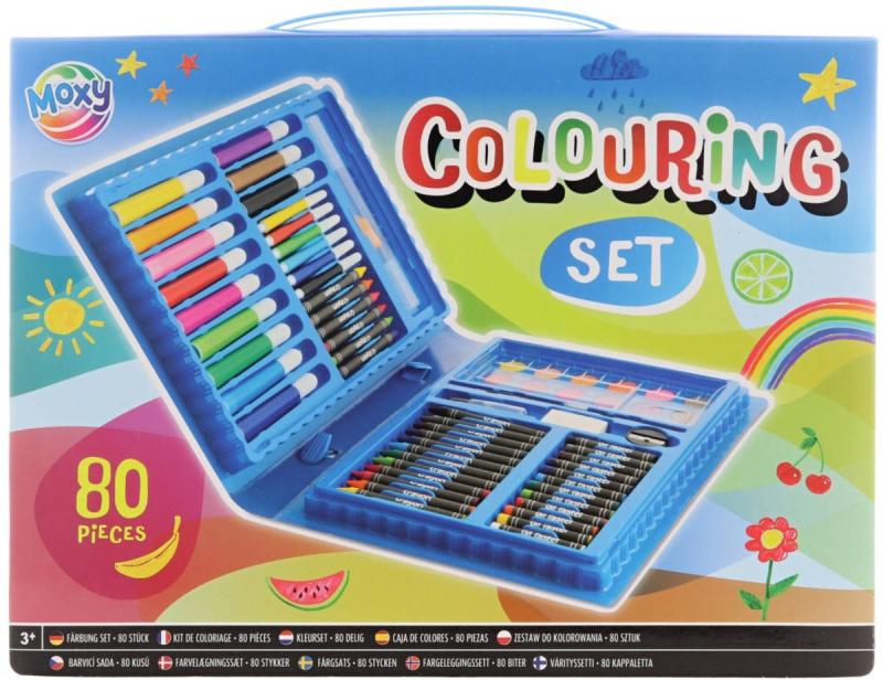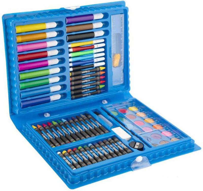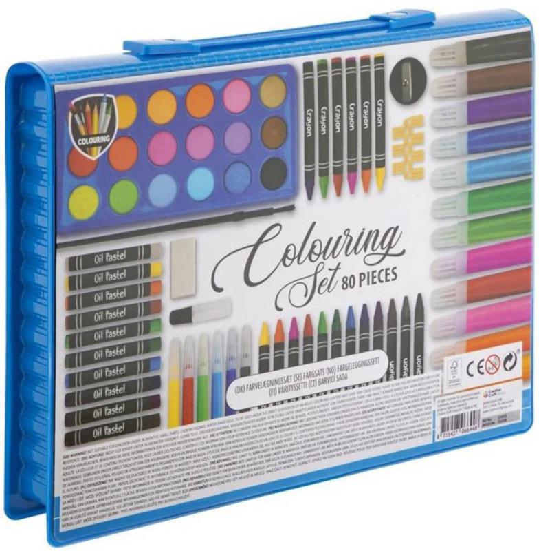 Malovací dětské výtvarné potřeby - velký set 80ks v kufříku. Kreativní sada obsahuje plastový kufřík, vodovky, fixy, voskovky, pastelky, ořezávátko a gumu - celkem 80 kusů.Objevte kouzlo barev a kreativity s tímto všestranným kufříkem, který obsahuje 80 různorodých výtvarných pomůcek – od voskovek a fixů, přes vodové i olejové barvy, až po praktické doplňky jako jsou sponky a štětec. Všechno je pečlivě zabaleno v kompaktním plastovém kufříku o rozměrech 28 × 21 × 4 cm, takže je ideální na doma i na cesty. Skvělé jako dárek, školní pomůcka nebo pro zábavný čas s rodinou.