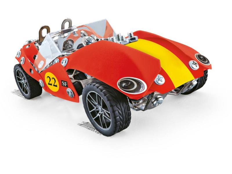 Malý mechanik: závodní auto. Kvalitní dětská stavebnice typu Merkur, z kovu a plastu. Model lze sestavit z 230 kovových součástí a plastových doplňků