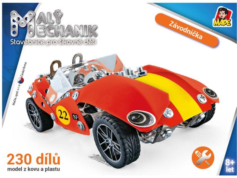 Český box v grafickém designu řady Malý mechanik. Malý mechanik závodní vůz - 230 dílů. Součástí každé sady je šroubovák a klíč pro povolování a utahování